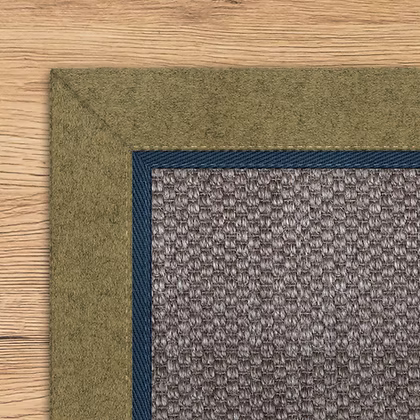 This rug features Sisal Divine in a Moonlight Mist weave, trimmed with a Wool Felt Marl Chartreuse/Camel outer border and a Cotton Herringbone Midnight inner border. Custom-made in nine sizes and three runners, each rug is a one-of-a-kind creation.
